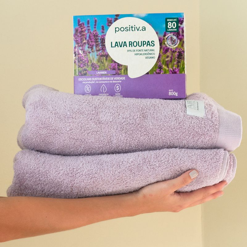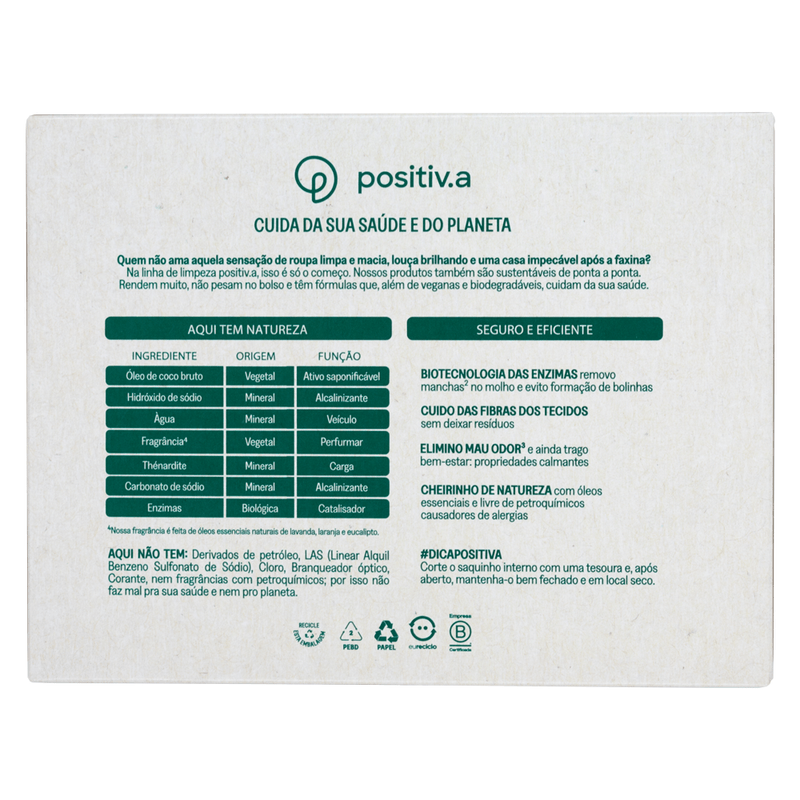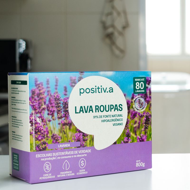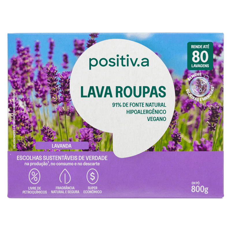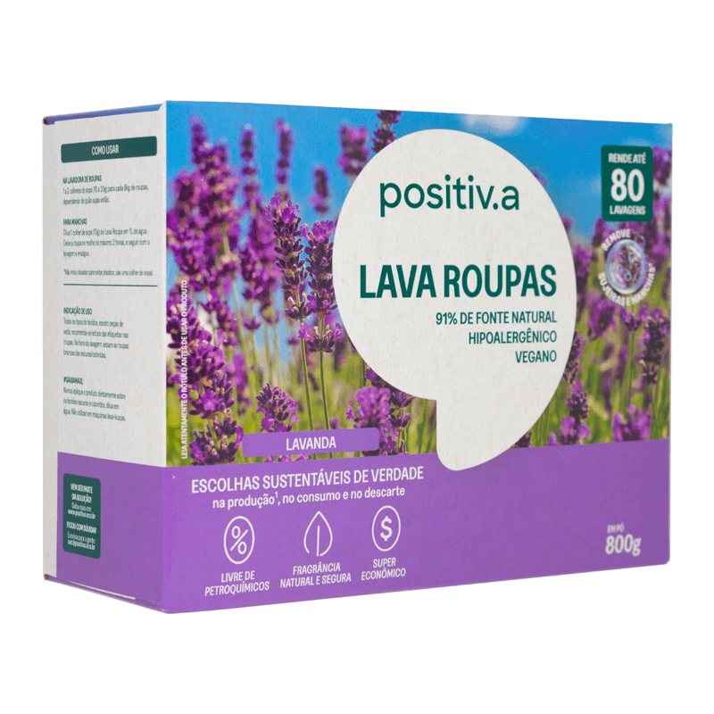 O Lava Roupas em Pó Lavanda 800g da positiv.a combina óleo de coco 100% vegetal com enzimas naturais e fragrância suave de lavanda, este sabão em pó combina potente ação de limpeza com delicadeza para a pele — uma fórmula 91% de origem natural, hipoalergênica, sem petróleo, corantes ou petroquímicos. Rende até 80 lavagens (6x mais que o convencional), clareia roupas brancas, preserva cores e sua fragrância é proveniente de óleos naturais e sua formulação biodegradável são seguras para roupas de bebê, tecidos delicados e peles sensíveis. Sua espuma cremosa não resseca mãos ou tecidos. Além disso, a embalagem pode ser descartada e reciclada com segurança.