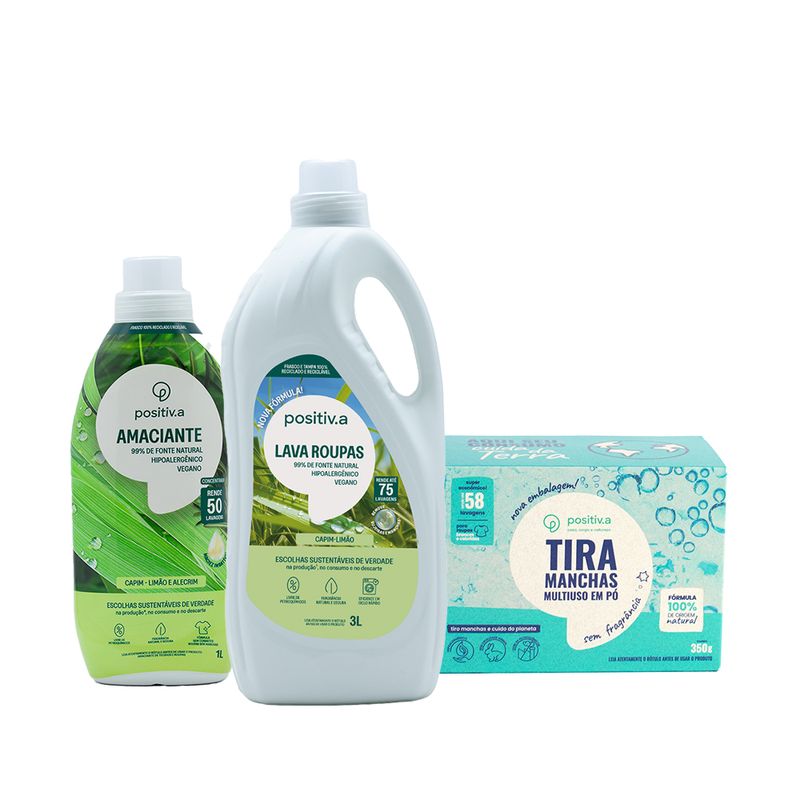 O Trio Lava Roupas Capim‑Limão positiv.a combina performance e cuidado consciente com três fórmulas naturais. Cada produto foi formulado com ingredientes de origem vegetal, sem petroquímicos, para oferecer limpeza eficaz, perfumação refrescante e cuidado com peles sensíveis.